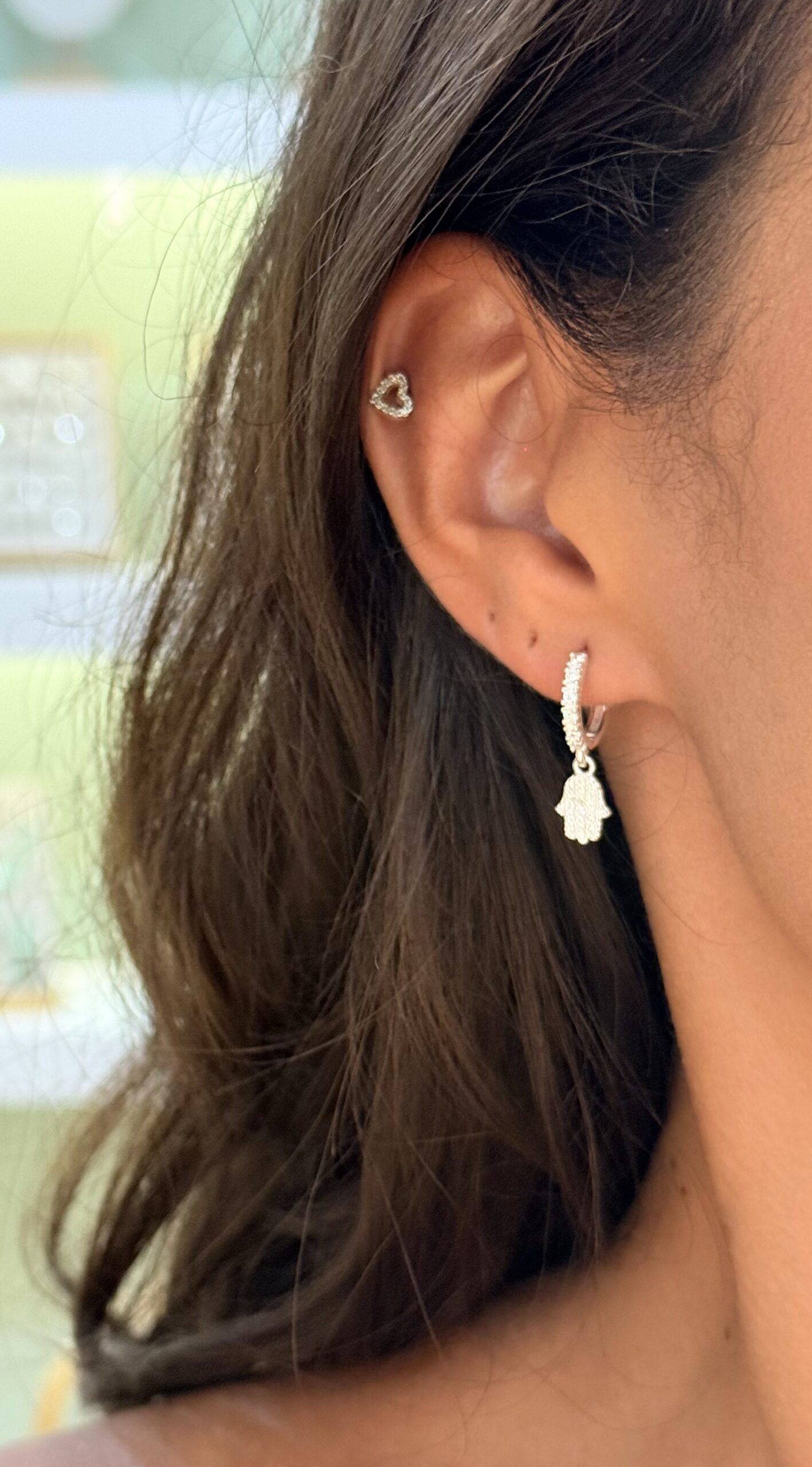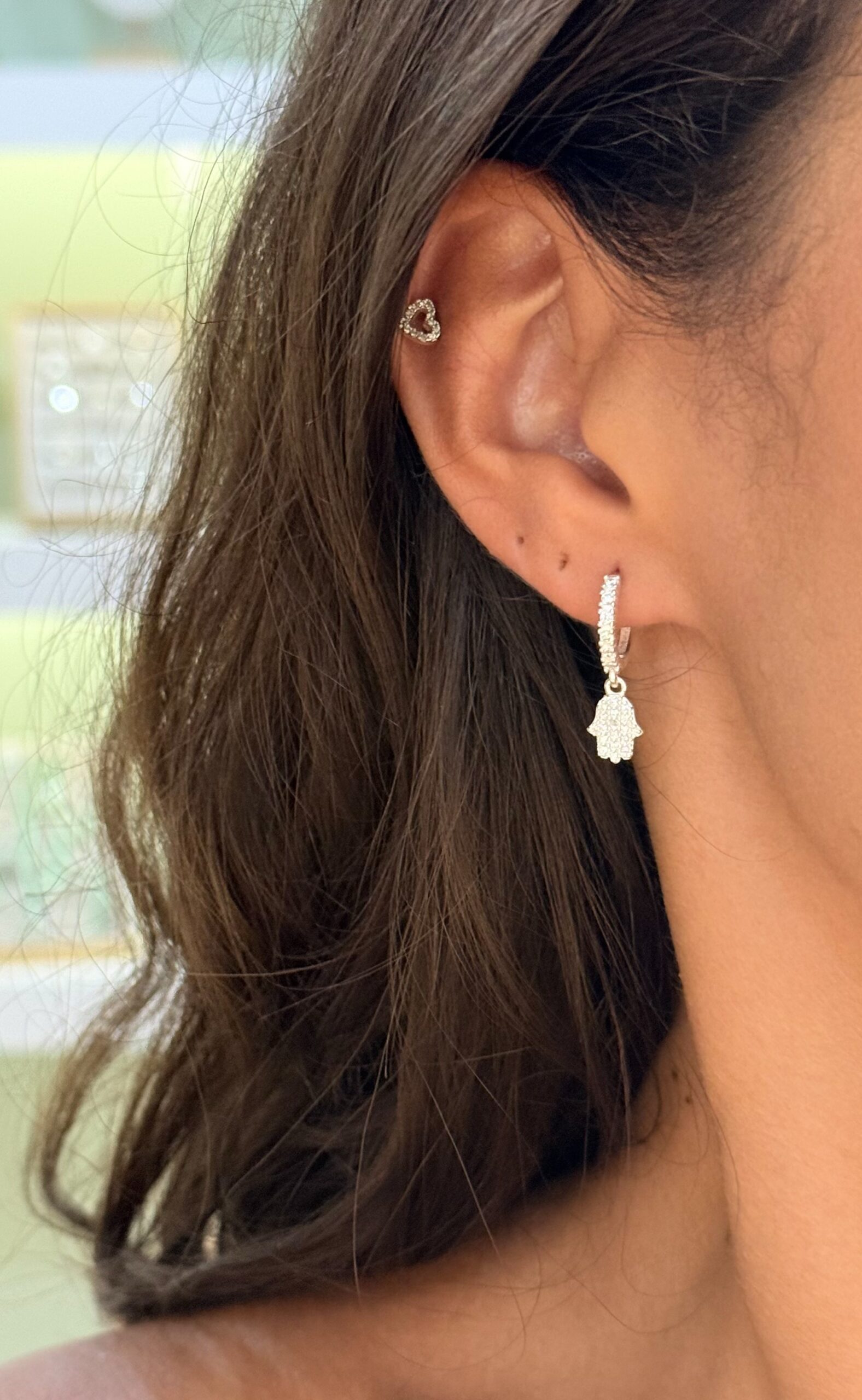 Argola em formato de mão hamsa toda cravejada em zircônias.