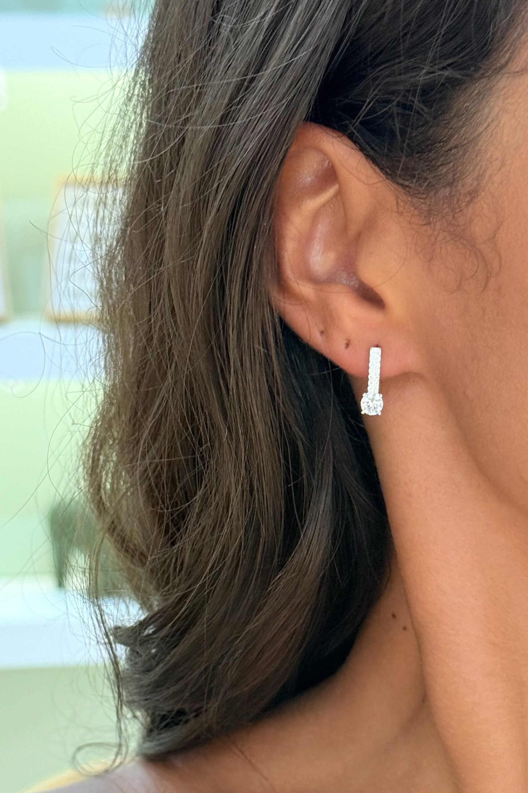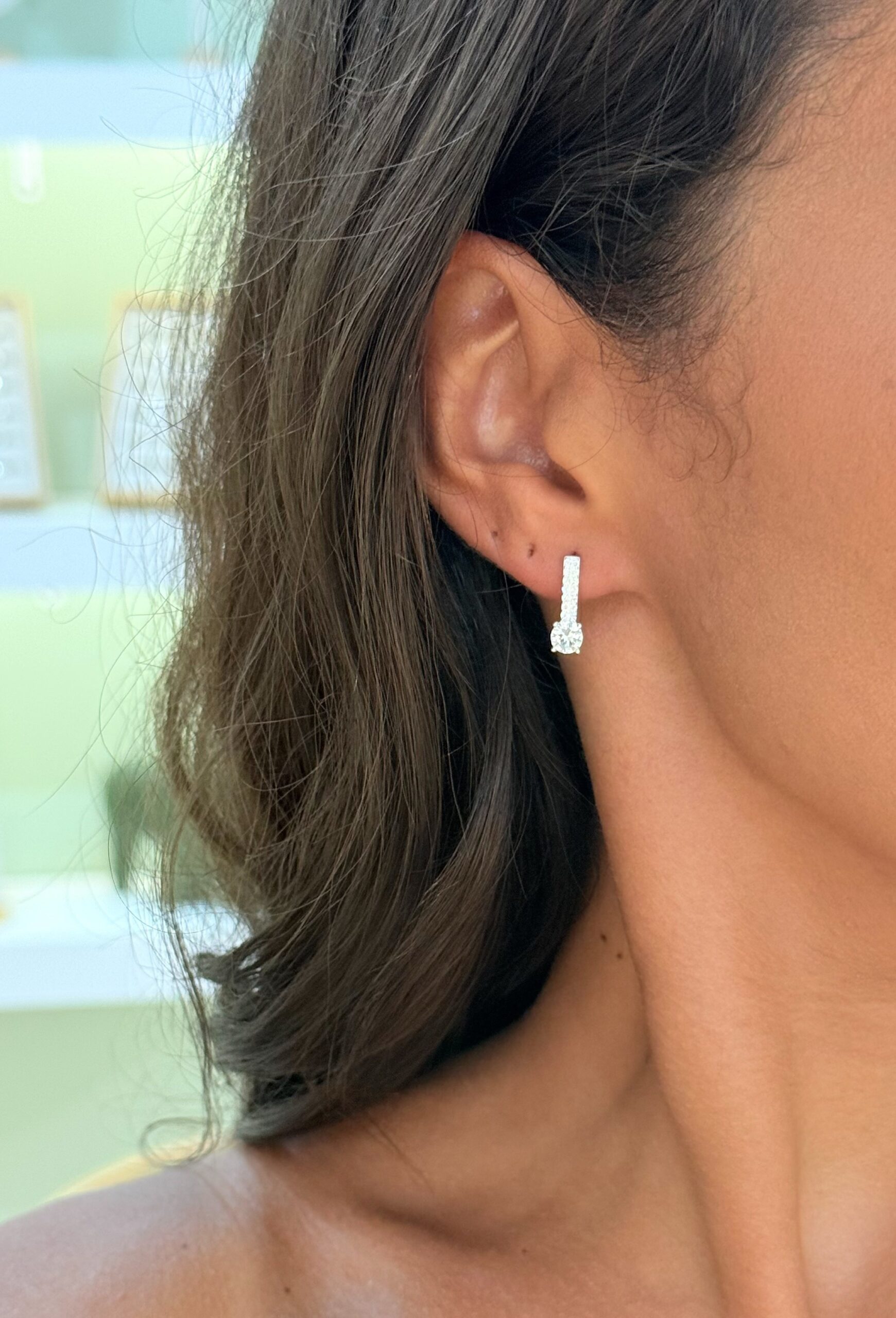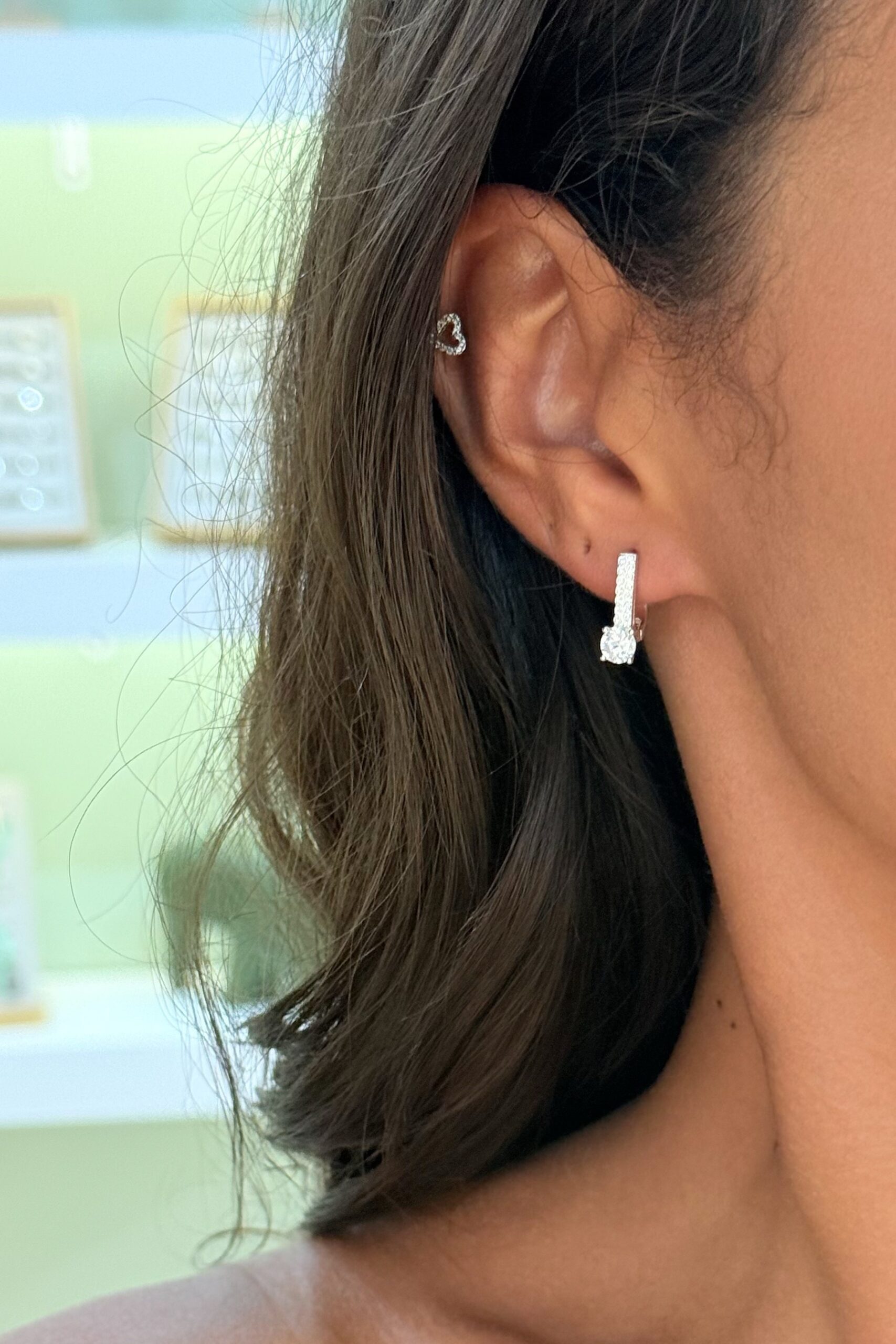 Argola em formato de U cravejada em zircônias com ponto de luz quadrada.
