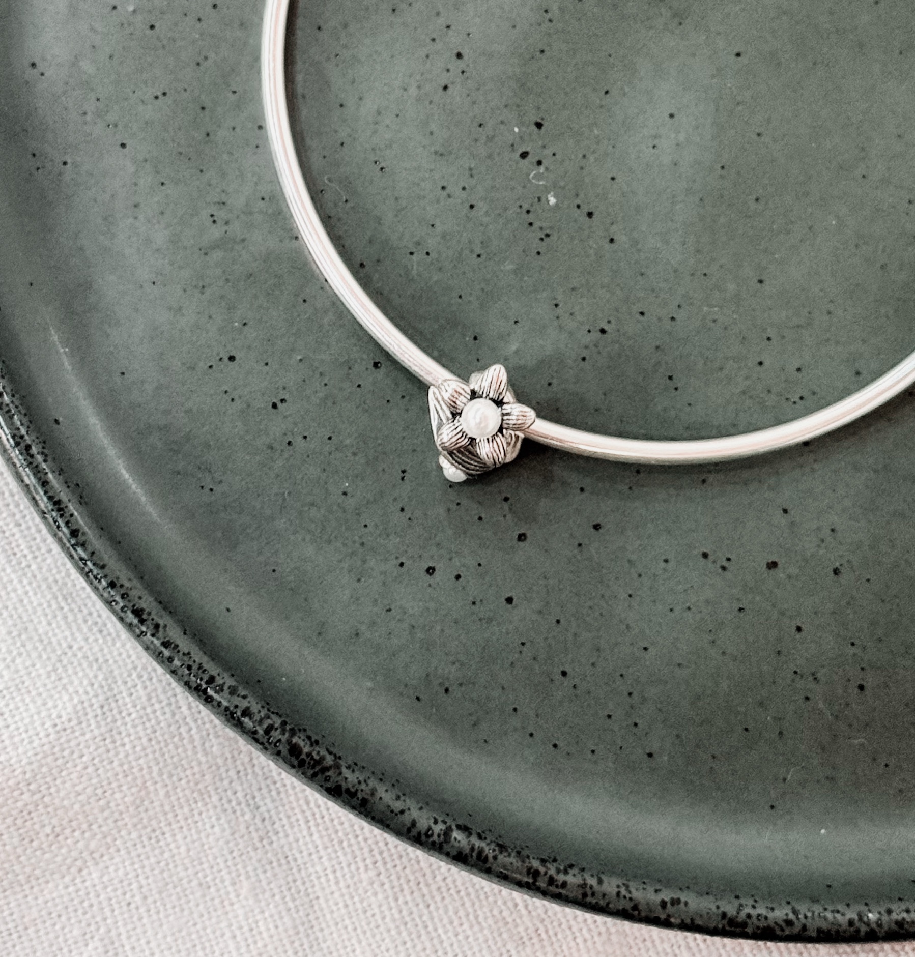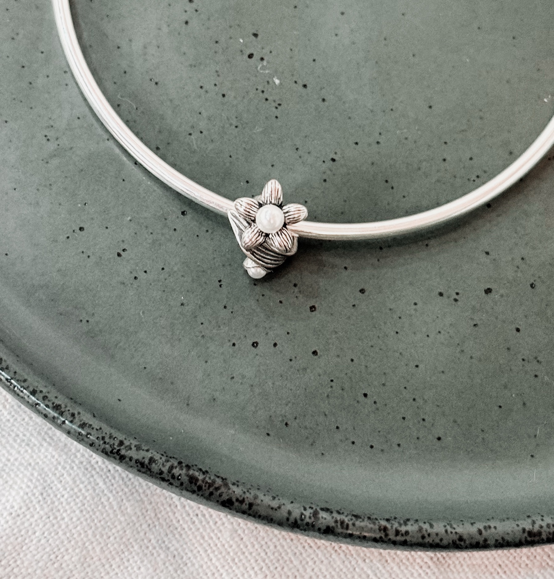 Berloque em formato de flor com pedras cravejadas, medindo 0,8cm.