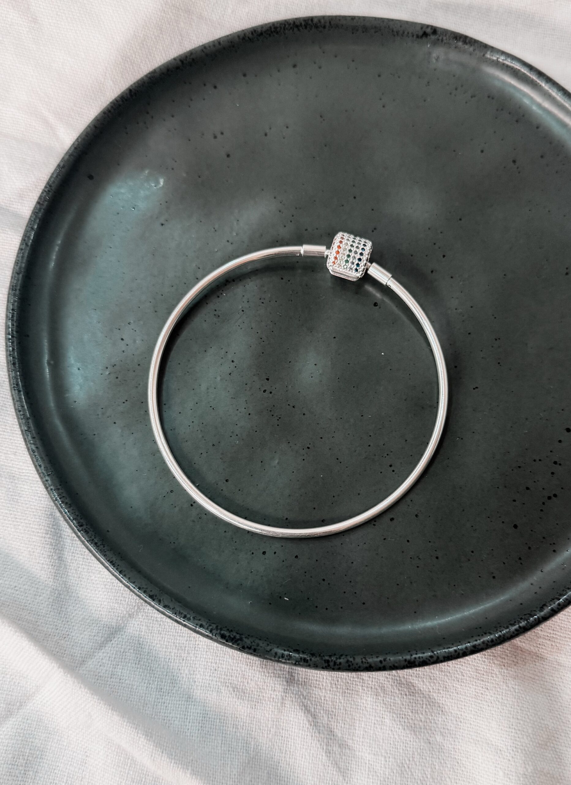 Bracelete em prata com pedras cravejadas em zirconias dentro do fecho Pand .