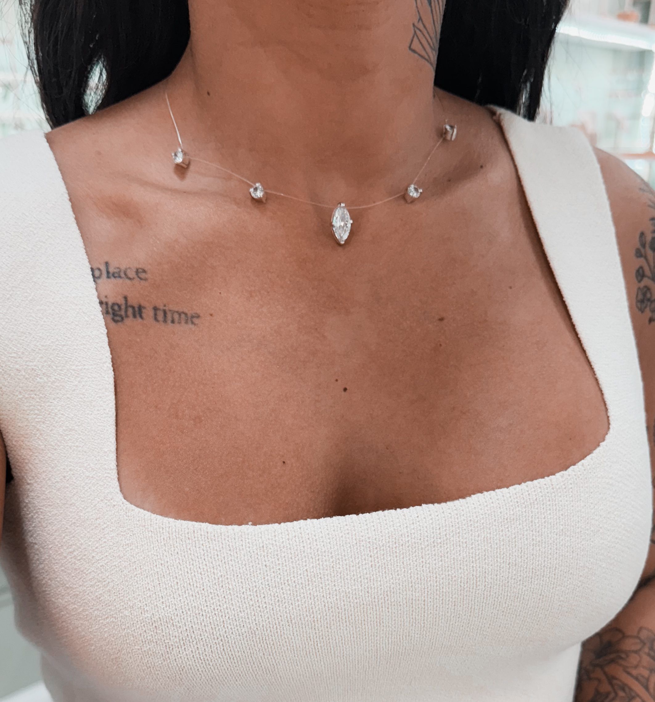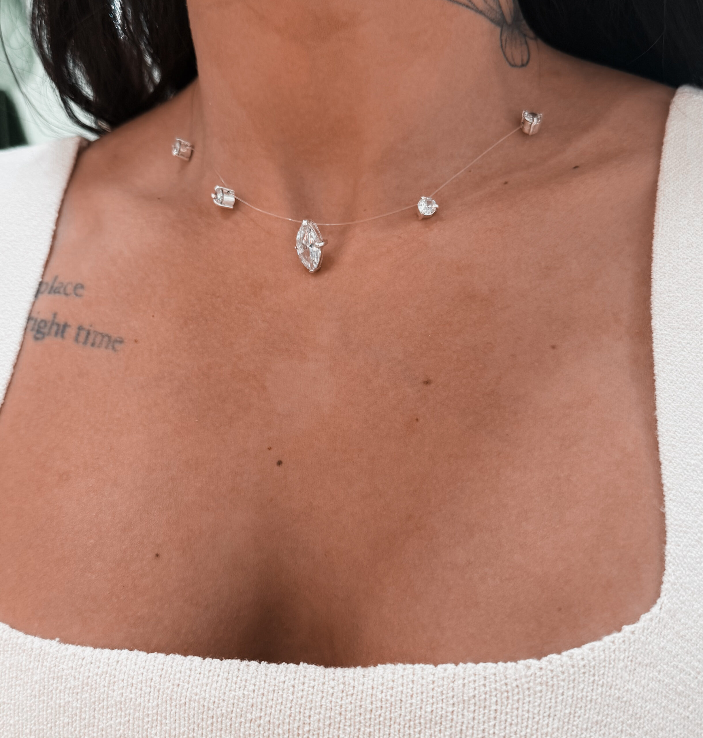 Colar em modelo nylon com pingentes com 5 pontos de luz em zircônias triangulares com o tamanho de 1cm de altura e 0,6cm de largura (Pedra central) As laterais são arredondas com um diametro de 0,4cm .