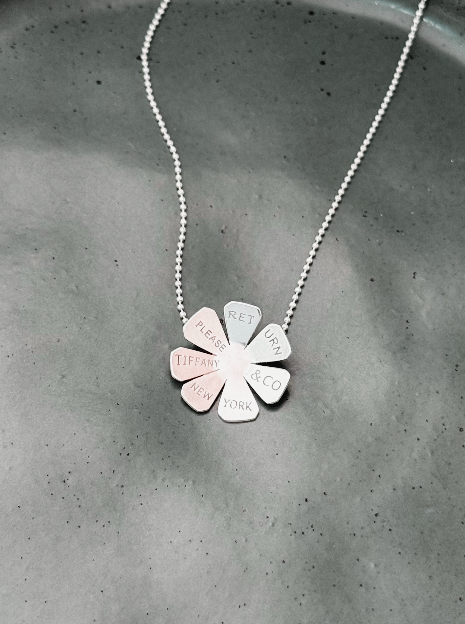 Colar em corrente bolinha diamantadas com pingente flor com escritas.