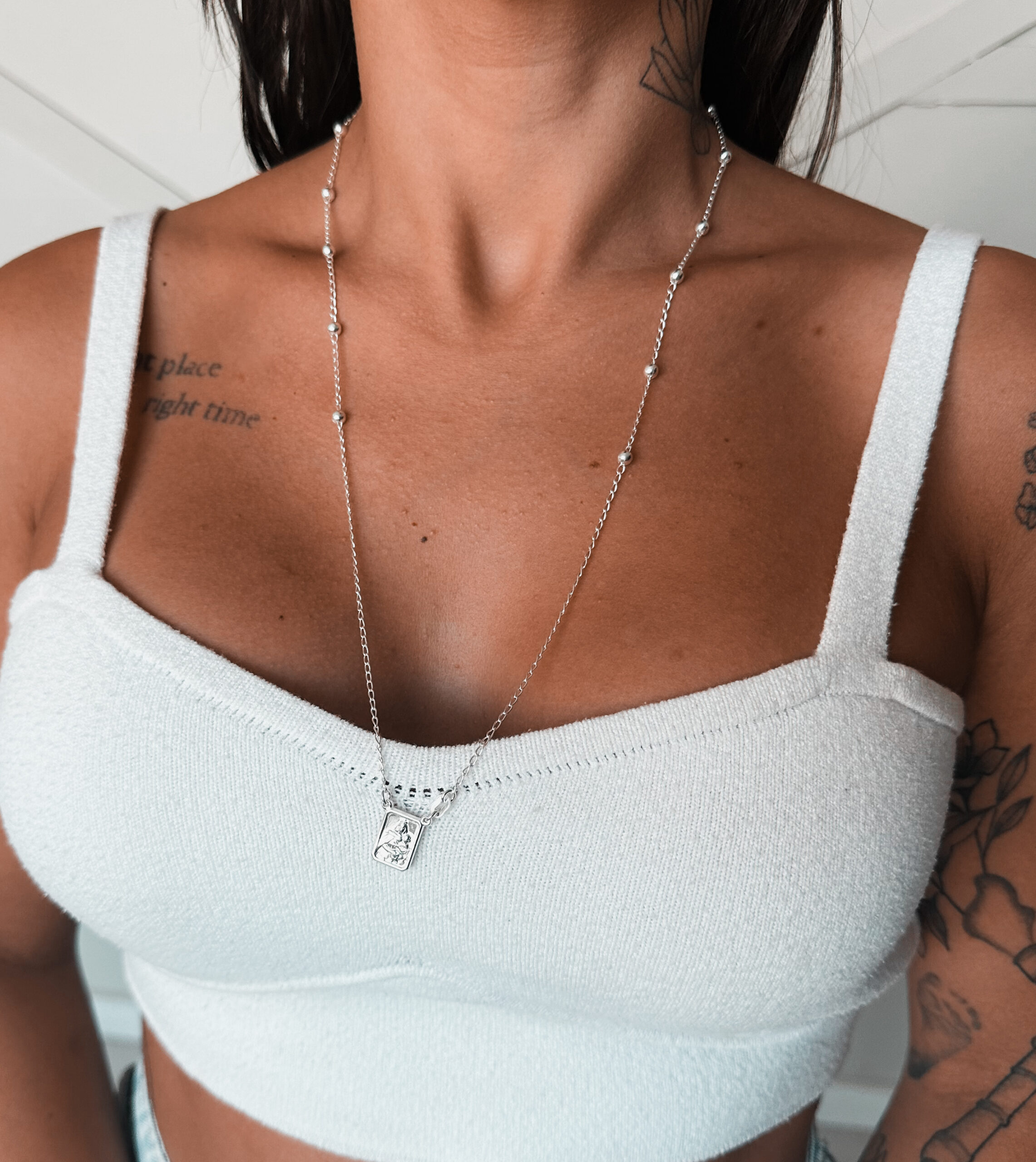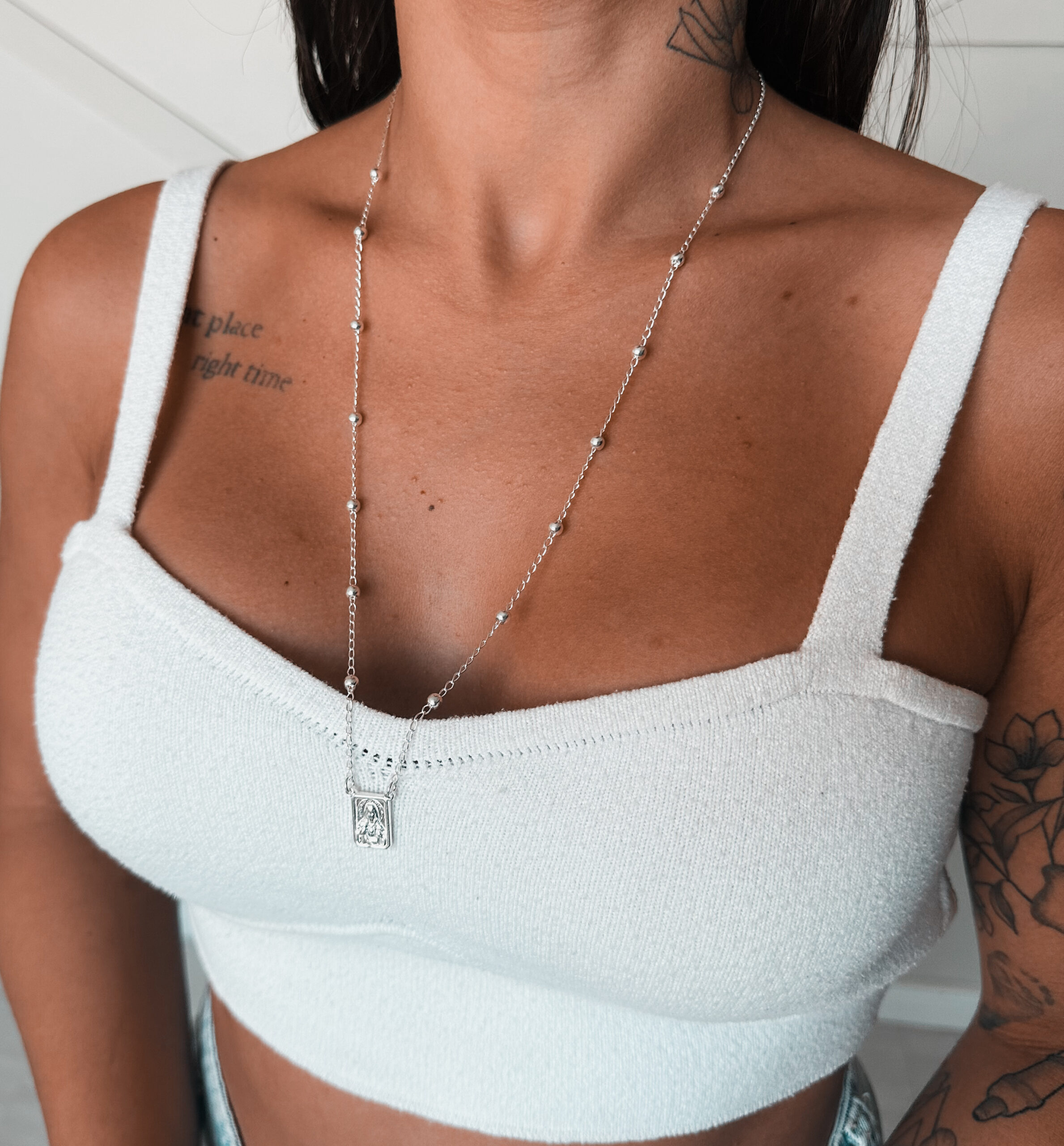 Escapulário corrente cadeado com bolinhas, medalha do Sagrado Coração de Jesus e da Nossa Senhora do Carmo 60cm.