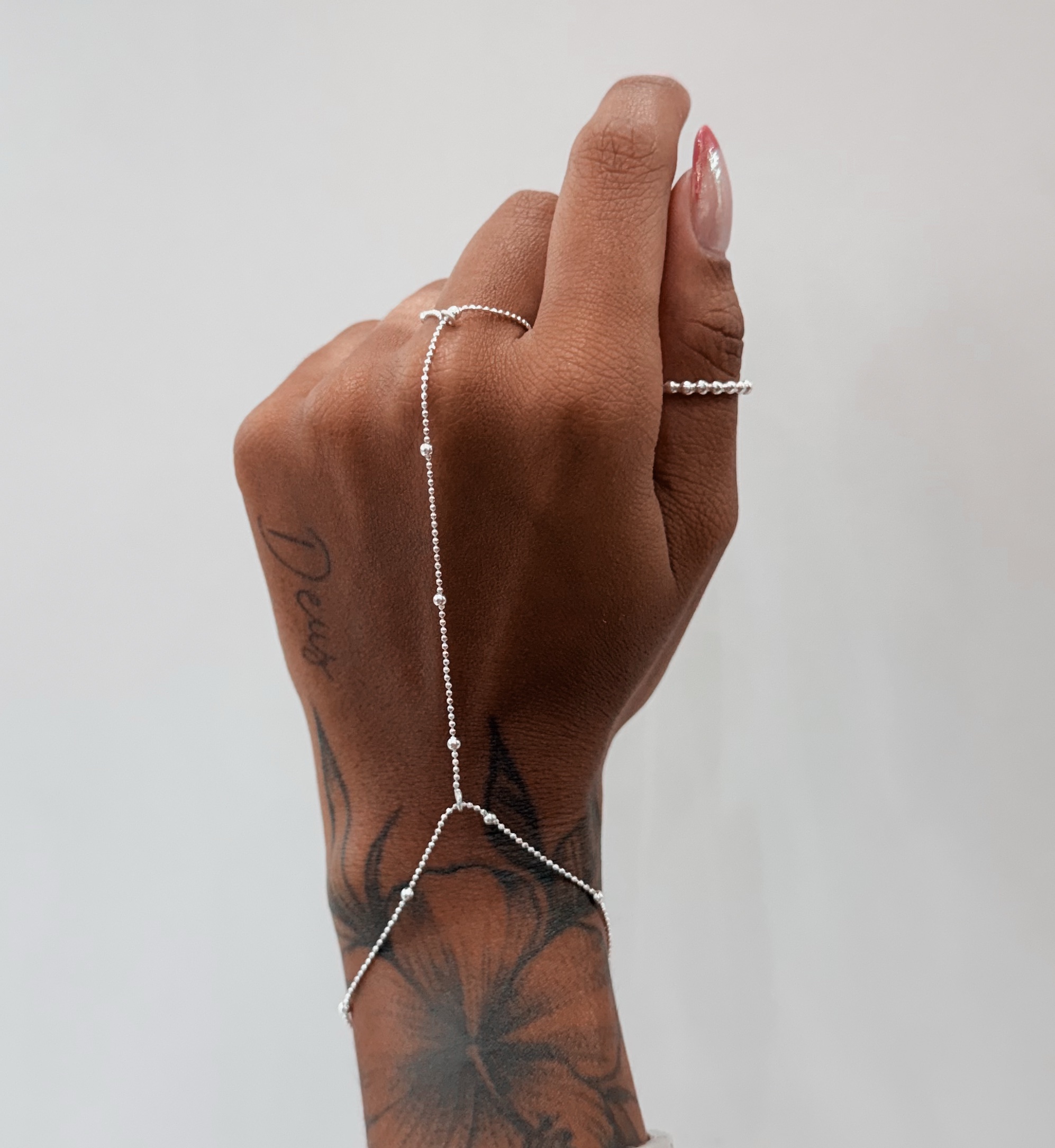Pulseira Hand Chain em modelo corrente bolinha com veneziana