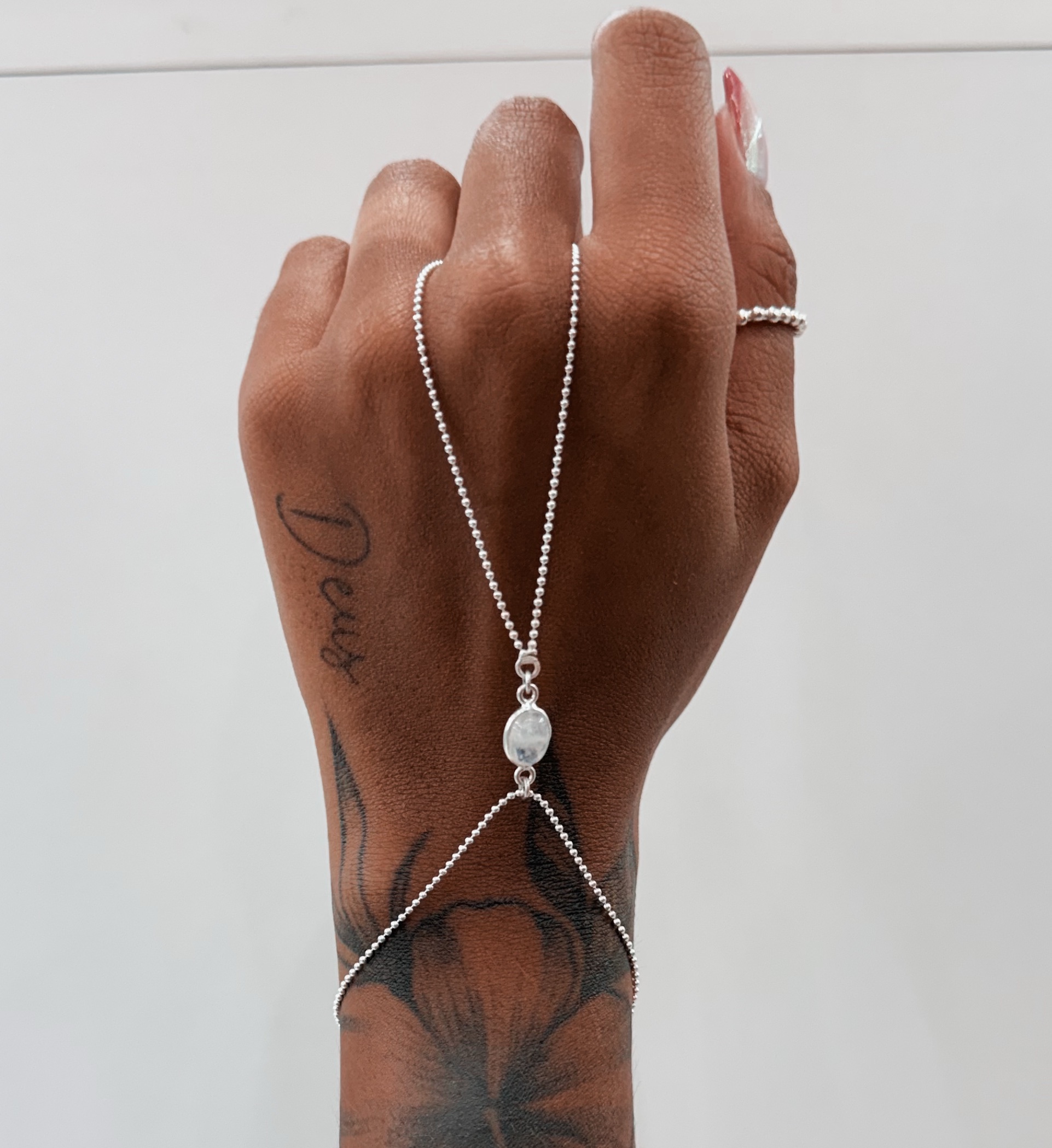 Pulseira Hand Chain em modelo corrente bolinha com Pedra da Lua em formato bolinha medindo 0,7cm de diametro