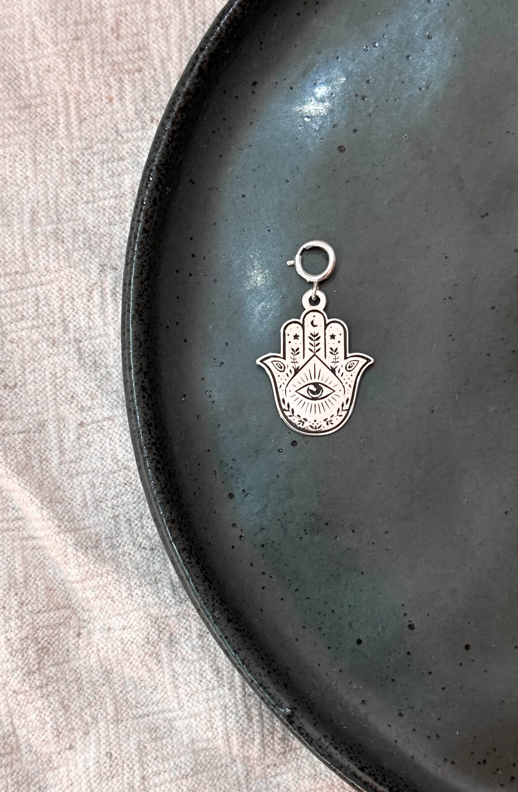 Pingente de formato em Mão Hamsam com fecho para colocar em colar, argolas e nosso anel Pin