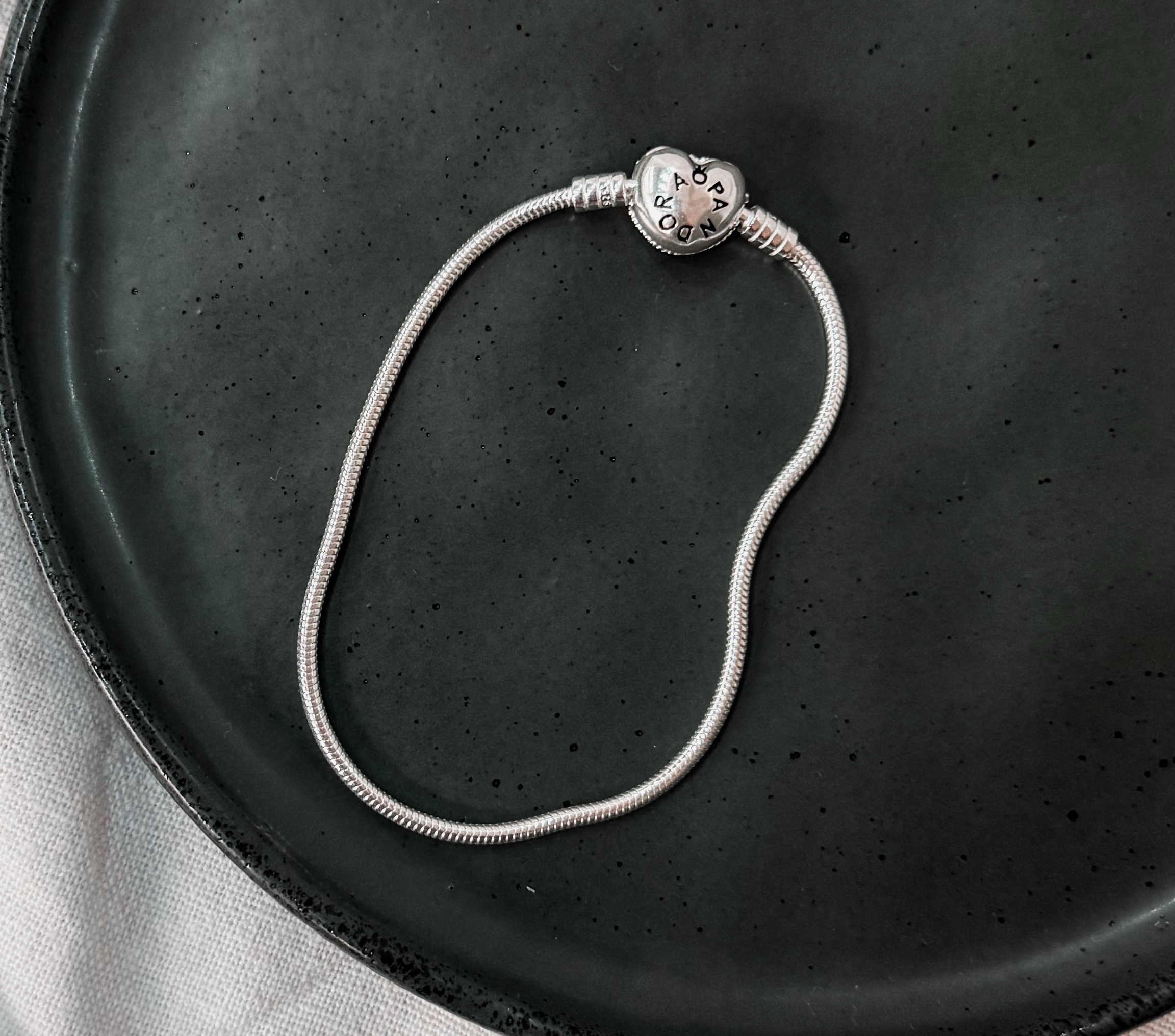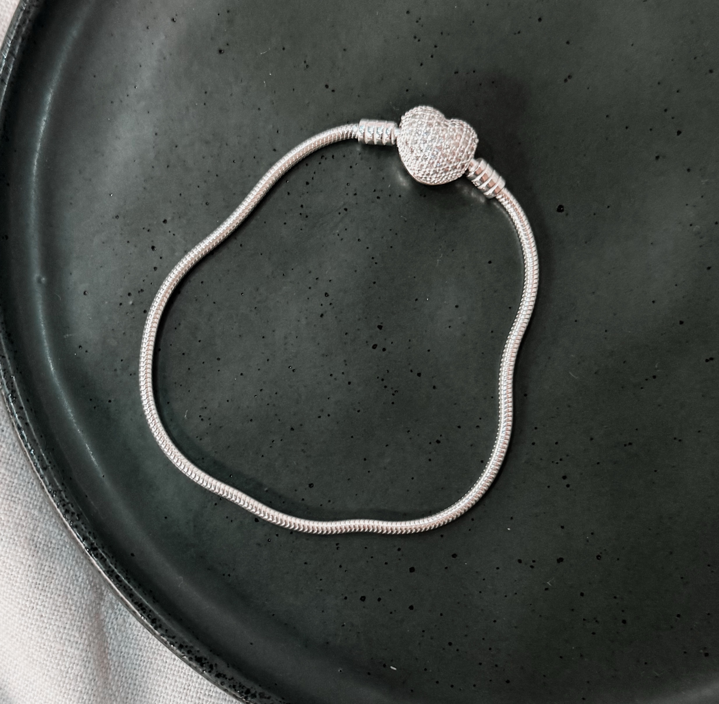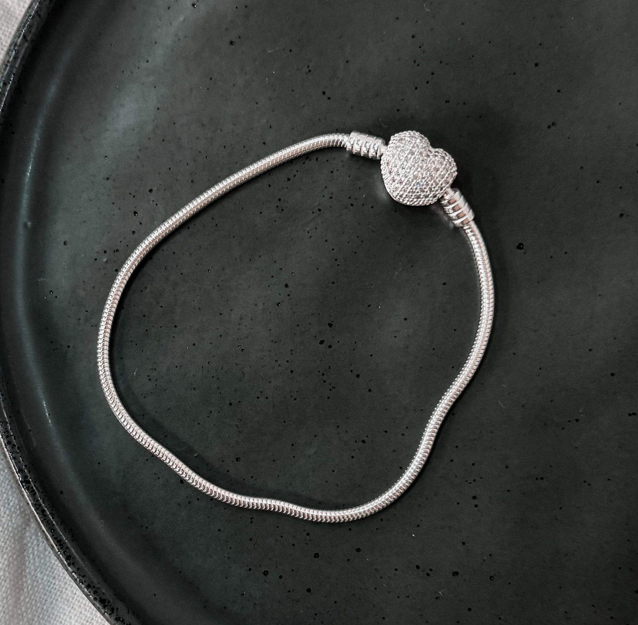 Pulseira Maleável em prata com fecho coração cravejado Pand .