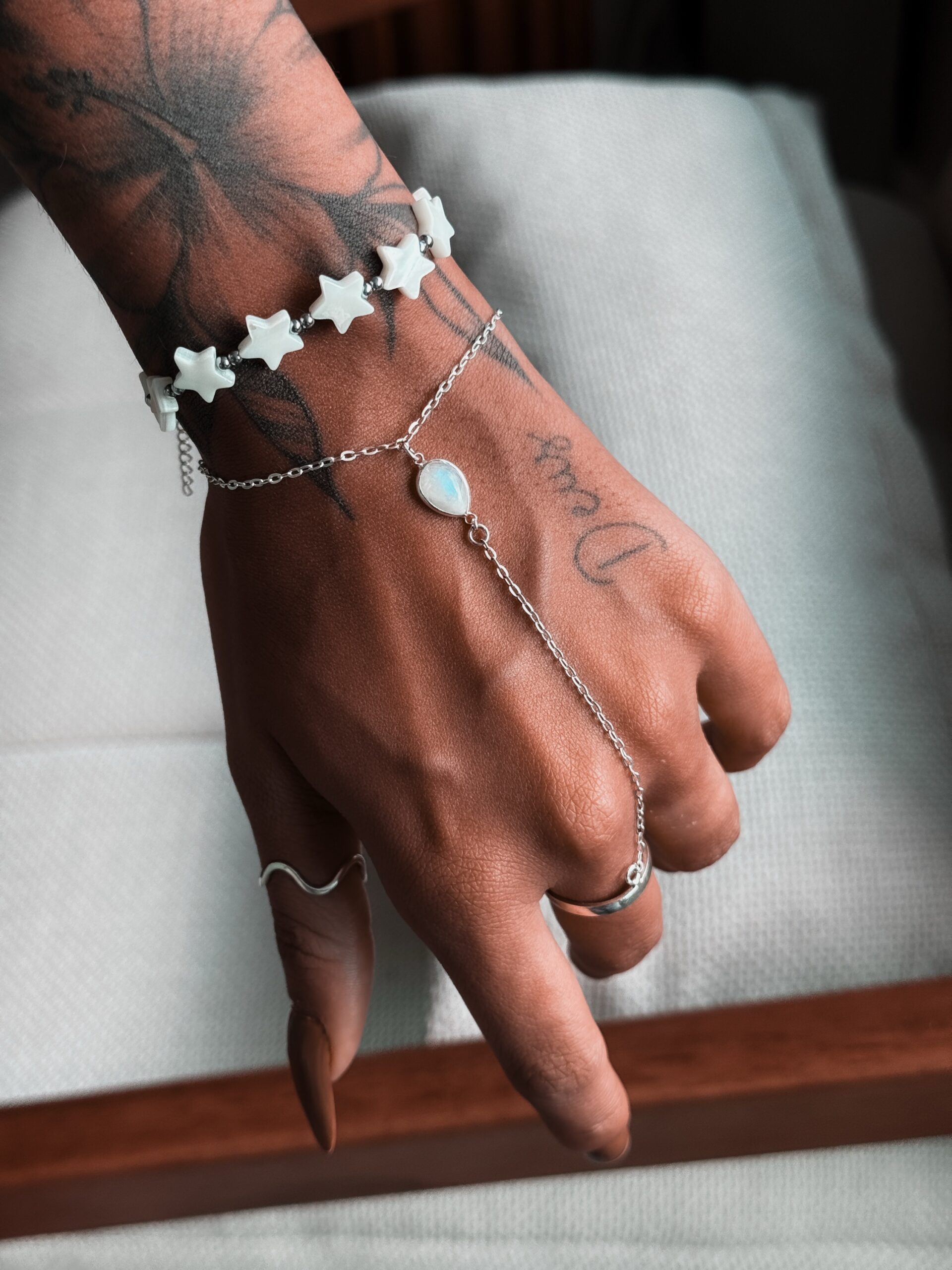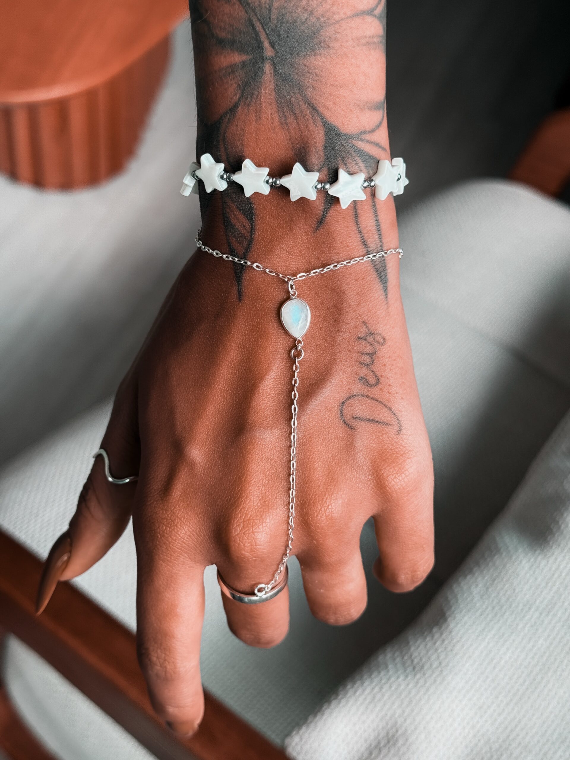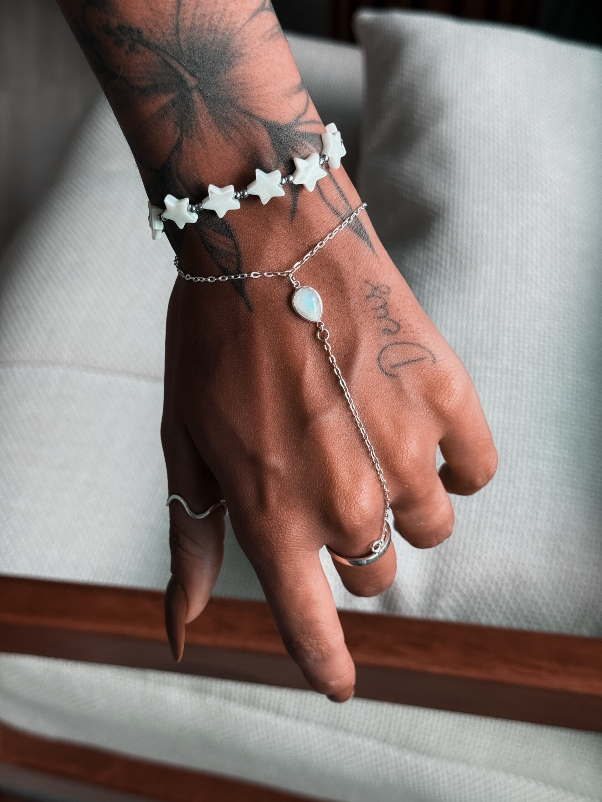 Pulseira hand chain com pedra da lua natural medindo 1cm de comprimento e o anel ele é regulável.